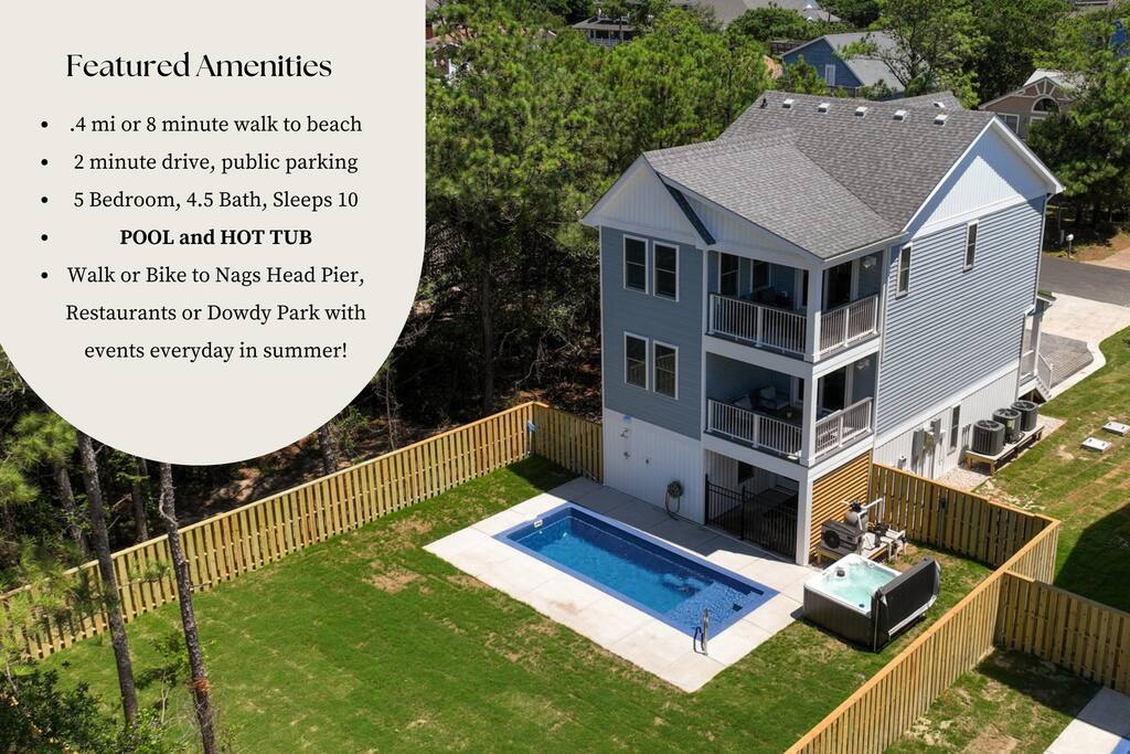 BRAND NEW Nags Head Retreat with Pool, Game Room, and Private Suites! Only .4 or 8 minute walk or 2 minute drive to the ocean access via Bainbridge Street or Nags Head Fishing Pier. Amble beach parking. >Professionally Designed< Next to twin cottage 'Park and Paddle'.